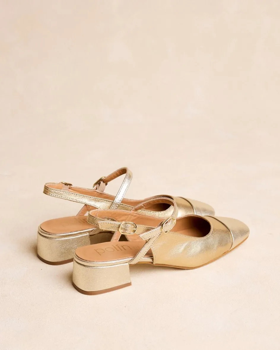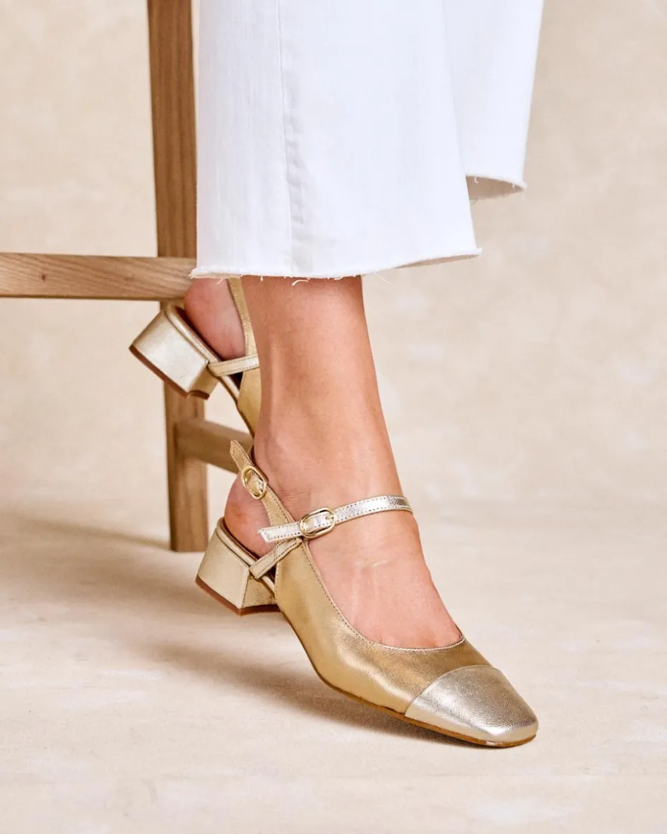 Escarpins dorés Mary Jane. Fermeture par sangle réglable avec boucles. Bout légèrement carré. Encolure arrondie. Une chaussure stylée et élégante pour un usage quotidien.