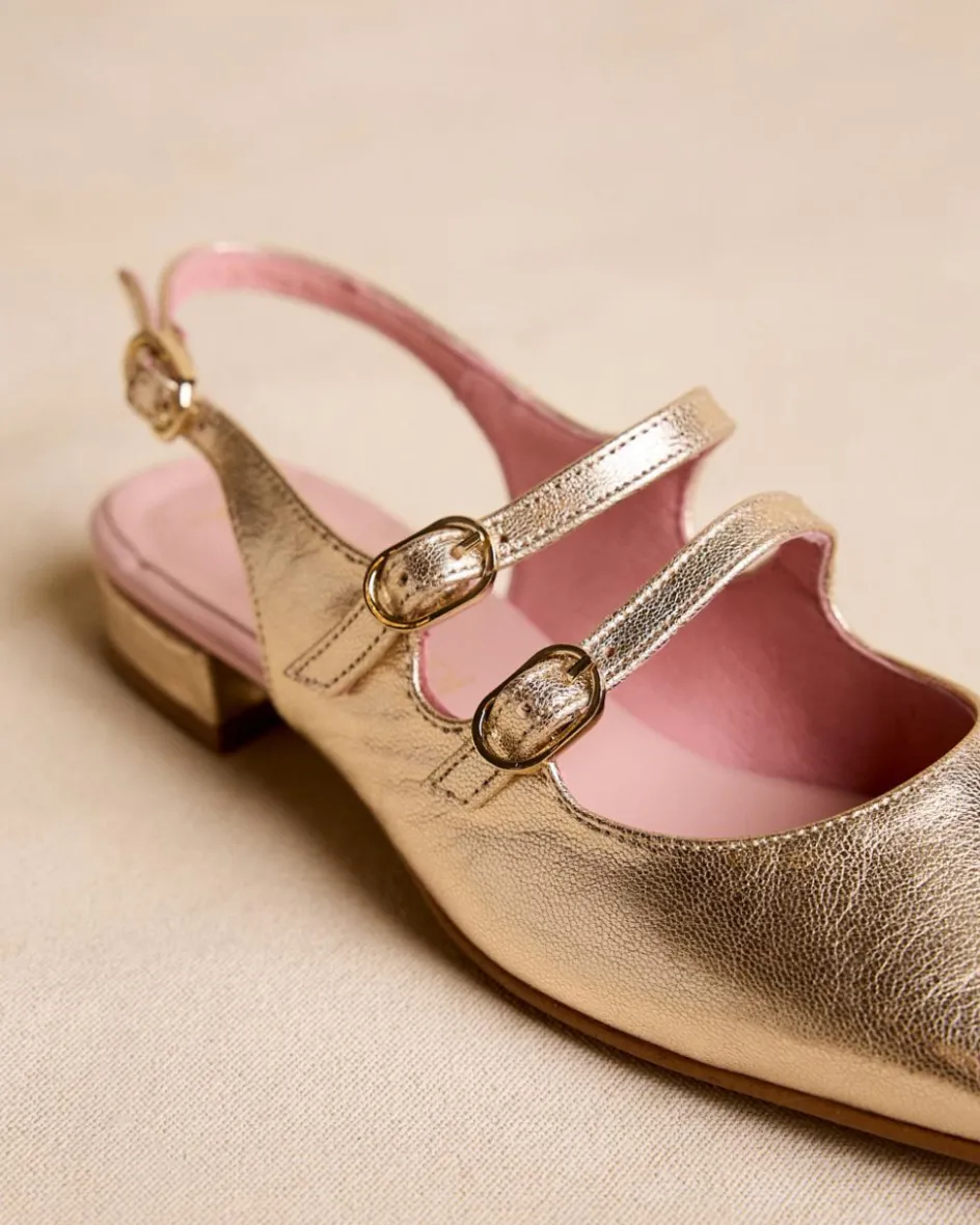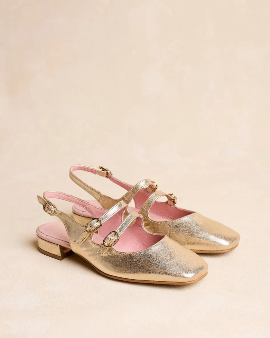 Escarpins dorés Mary Jane. Fermeture à double à lanière réglable avec boucles. Bout légèrement carré. Encolure arrondie. Une chaussure stylée et élégante pour un usage quotidien.