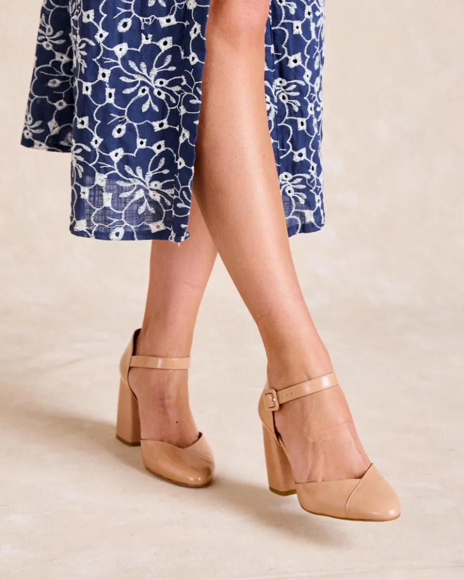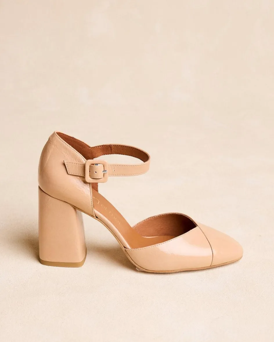 Sandale à talons hauts de couleur nude avec une sangle épaisse de 2,5 cm de support devant un crochet à boucle ronde. Bout ouvert rond sans plateforme. Idéal pour les evénements spéciales. Son design élégant et sa couleur vont avec tout ! Sans aucun doute des talons jokers indispensables pour toutes les occasions !