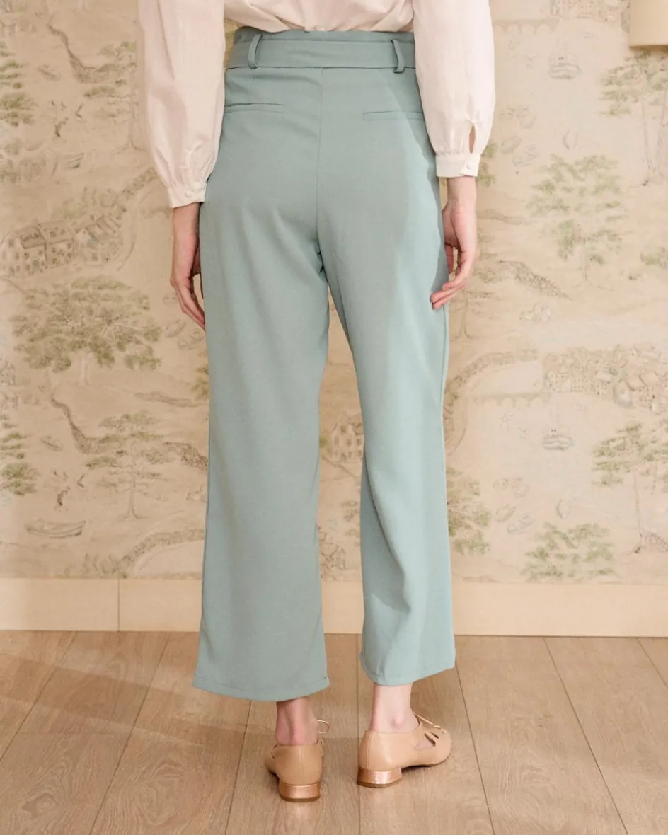 Pantalon vert d’eau, coupe droite avec ceinture intégrée, taille haute et coupe cheville