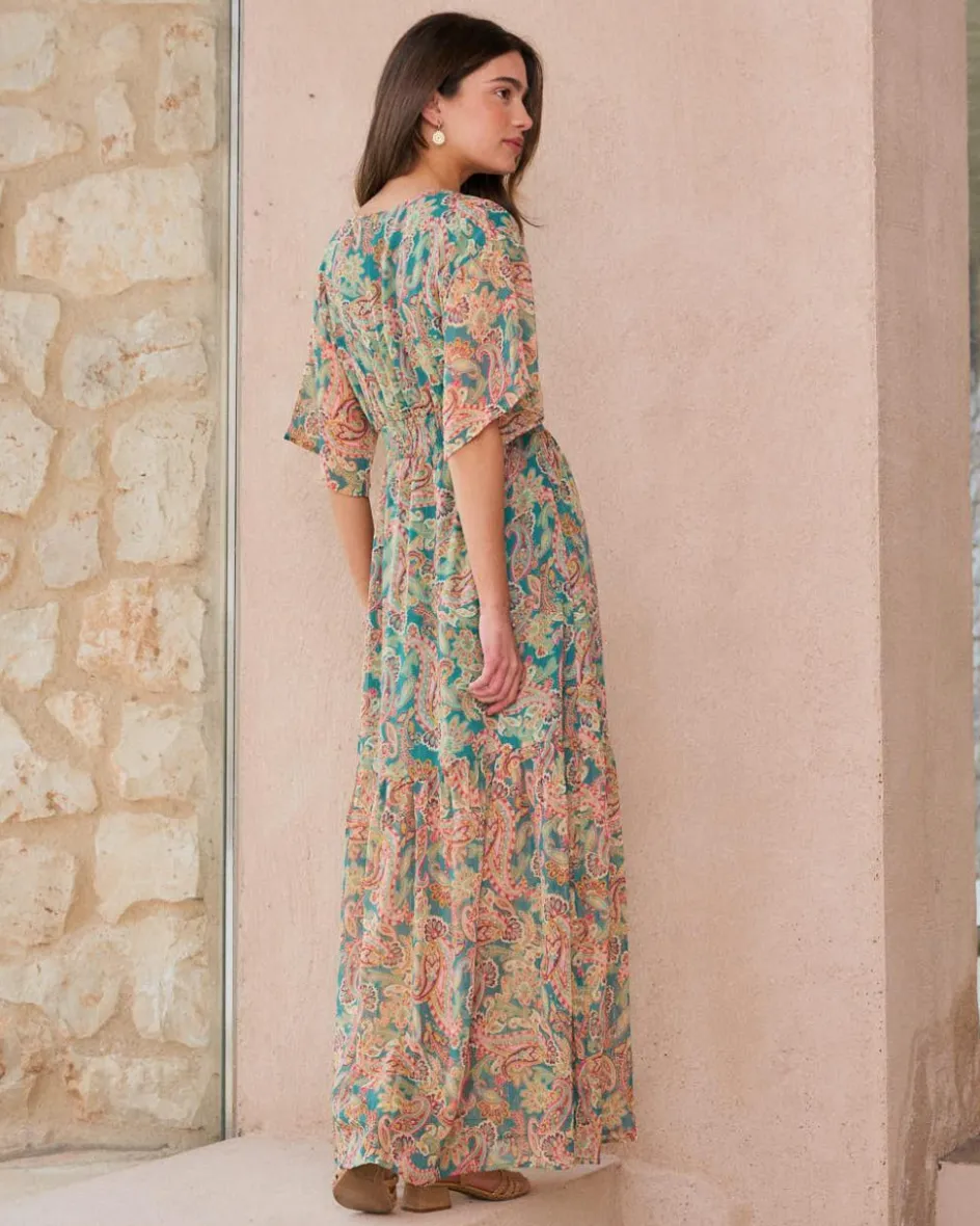 Robe longue vert émeraude avec imprimer floral, design fluide, encolure en V et manches courtes fluides.