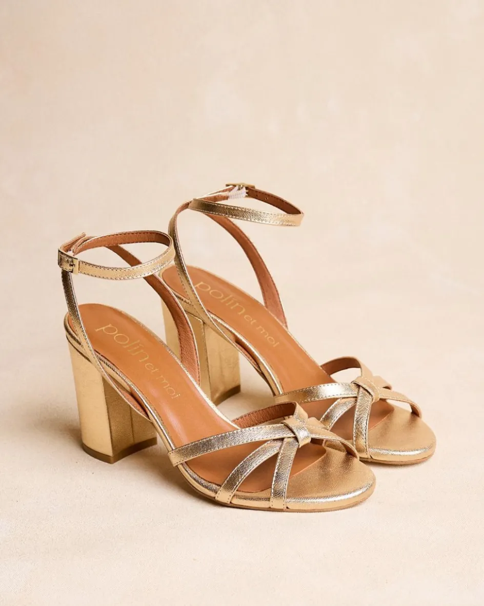 Sandale à talons dorés. Pointe carrée aux coins légèrement arrondis. Encolure avec trois rubans croisés. Fermeture de la cheville par sangle réglable avec boucle carrée. Une chaussure élégante et confortable.