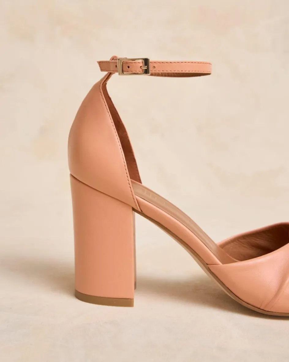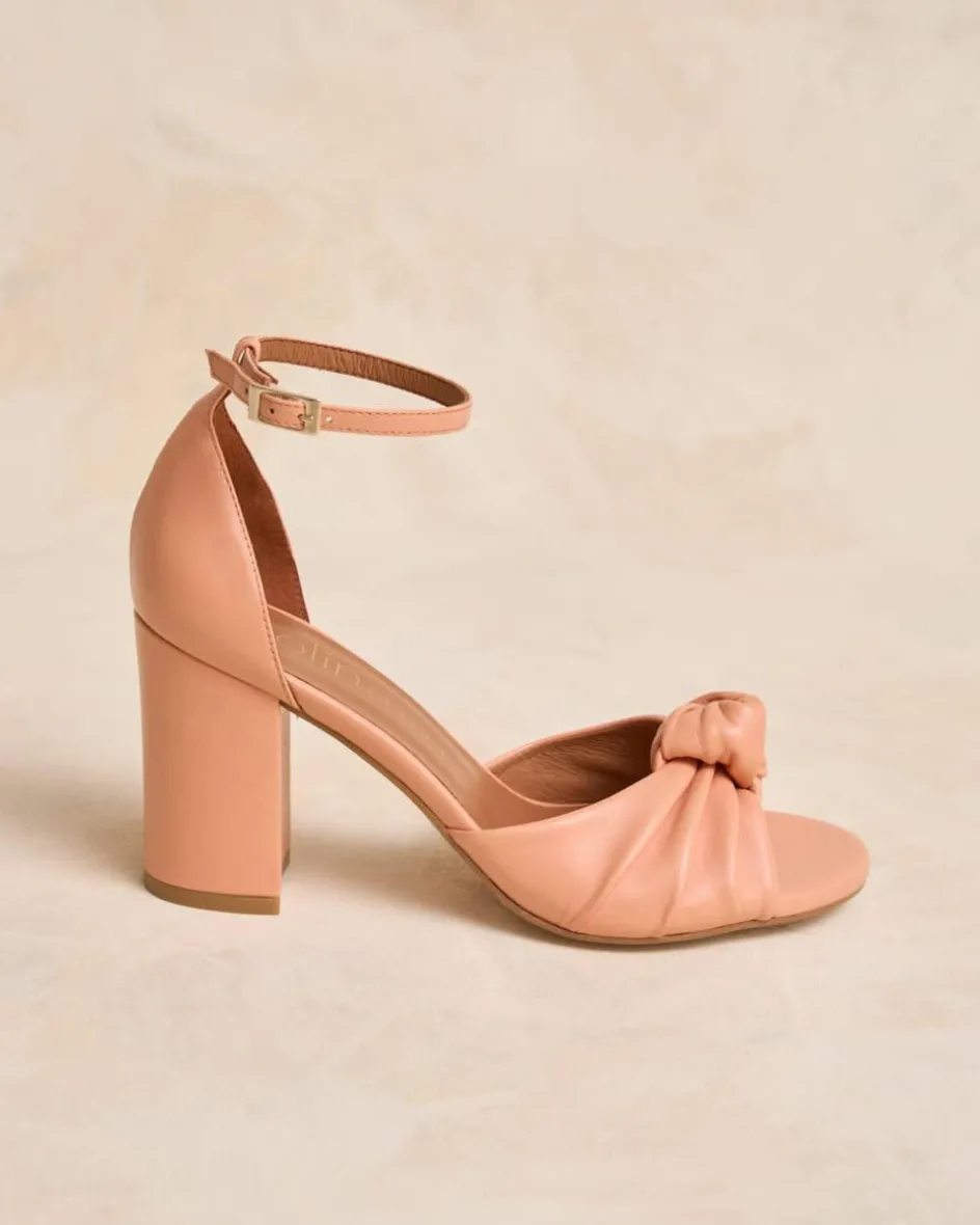 Sandale à talon pêche. Pointe arrondie. Encolure avec détail de nœud au centre. Fermeture de la cheville par sangle réglable avec boucle carrée. Une chaussure élégante et confortable.