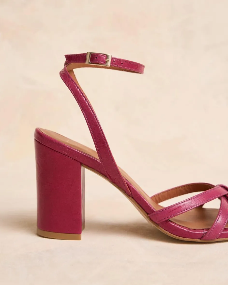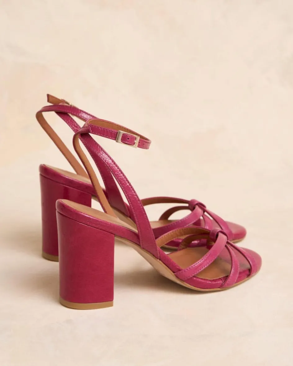 Sandale à talons de couleur bougainvillière avec plusieurs rubans qui se croisent en formant un nœud au centre. Pointe arrondie. Fermeture de la cheville par sangle réglable avec boucle carrée. Talon large pour plus de confort. Une chaussure très féminine et élégante pour le evénements de cette saison.