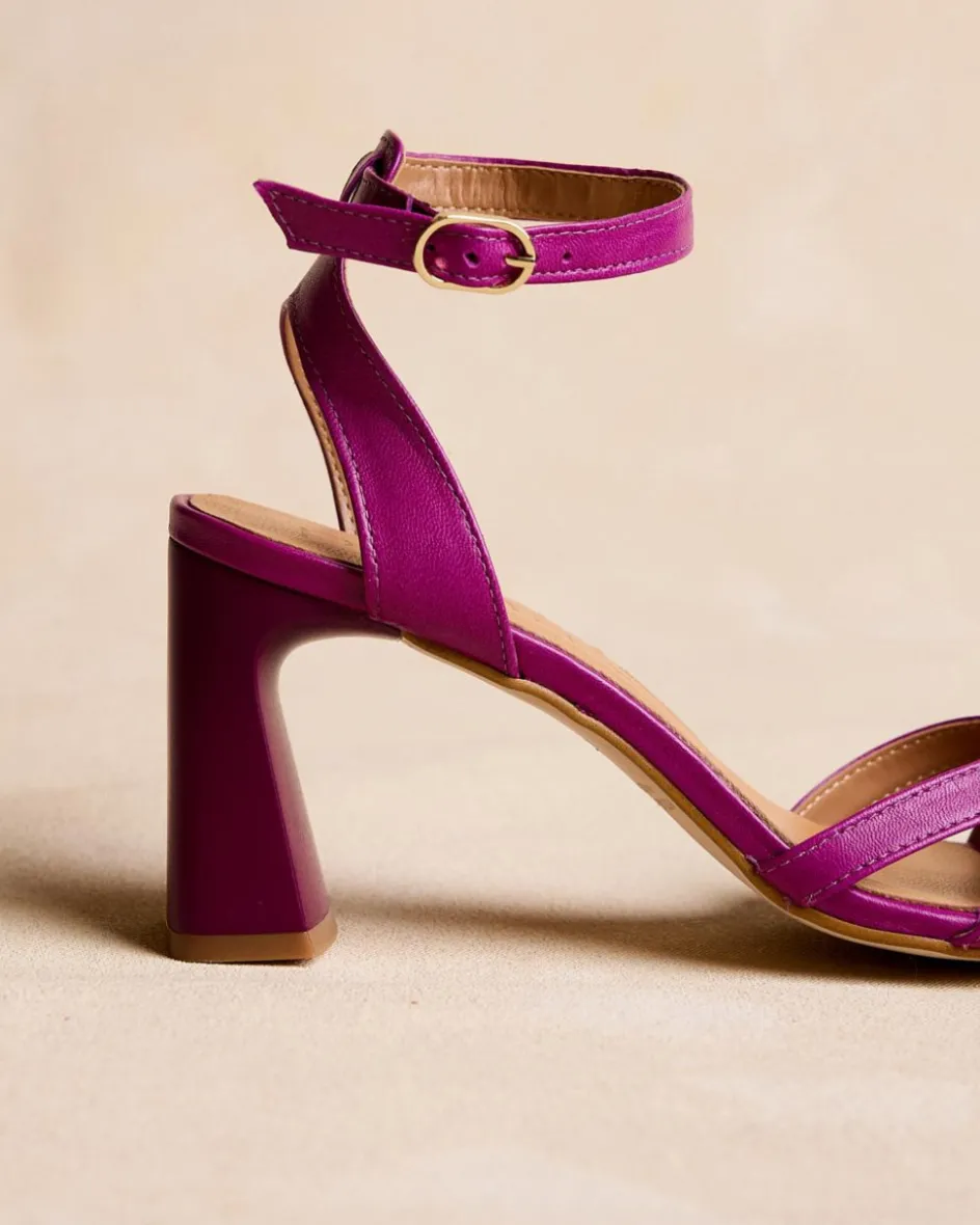 Sandale à talons couleur bougainvillier. Pointe carrée aux coins légèrement arrondis. Encolure avec trois rubans croisés. Fermeture de la cheville par sangle réglable avec boucle carrée. Une chaussure élégante et confortable.