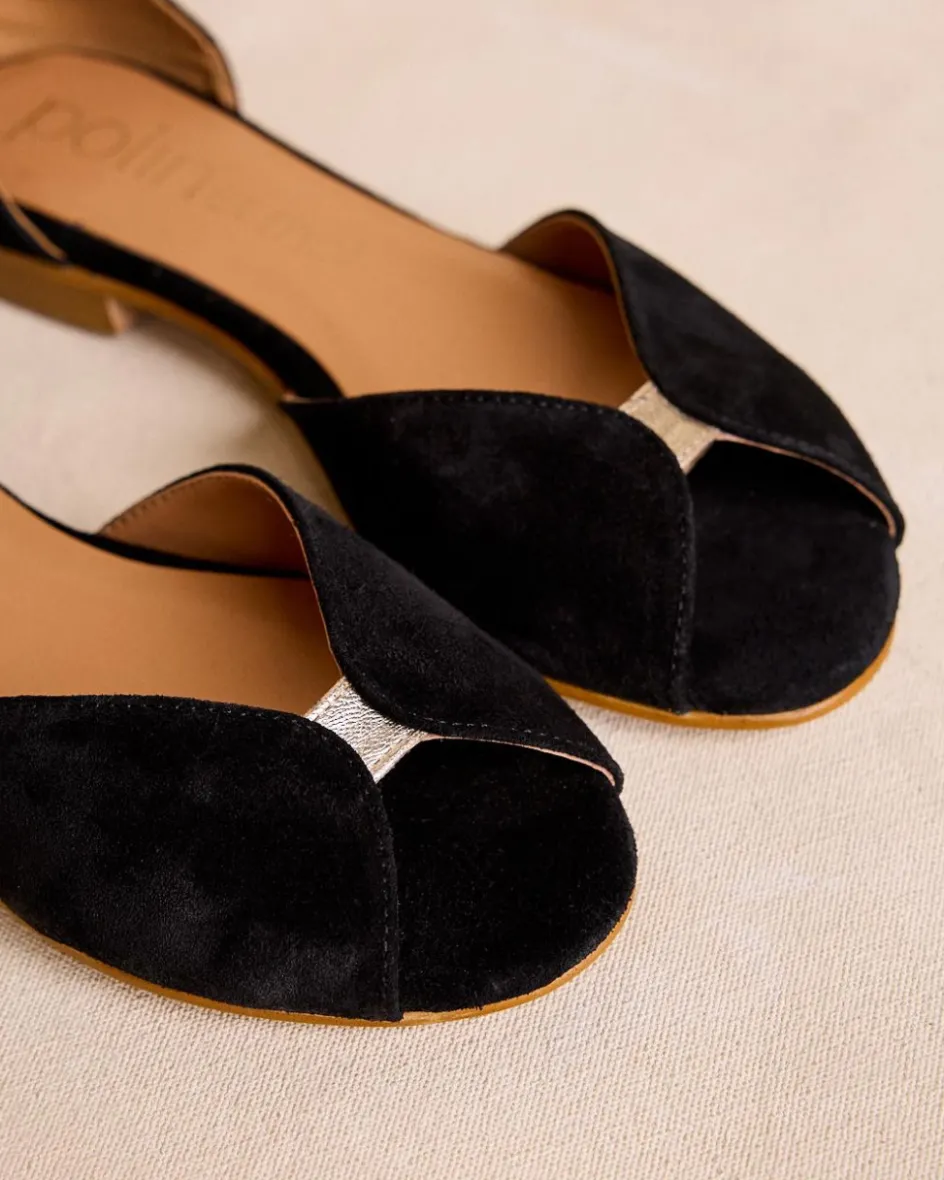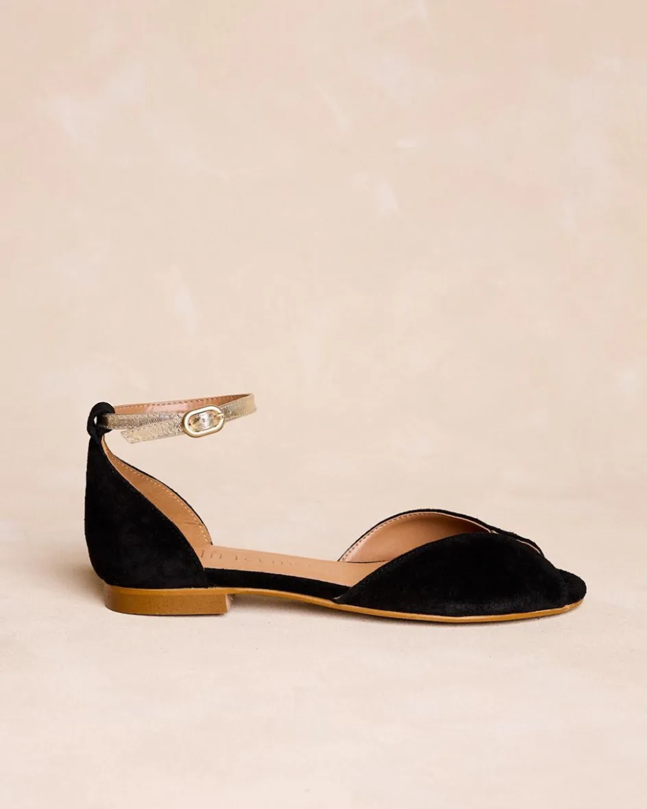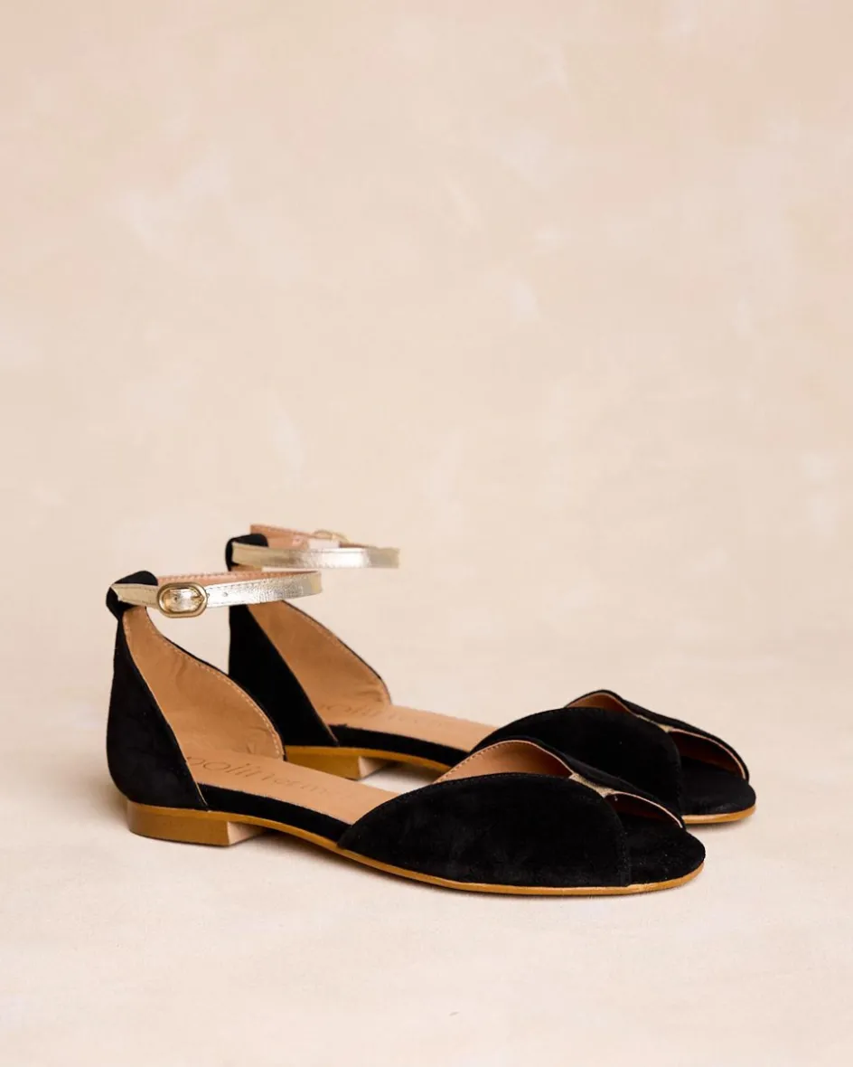 Sandales noires à bout ouvert avec bracelet de cheville délicat. Parfait pour un look frais et féminin.
