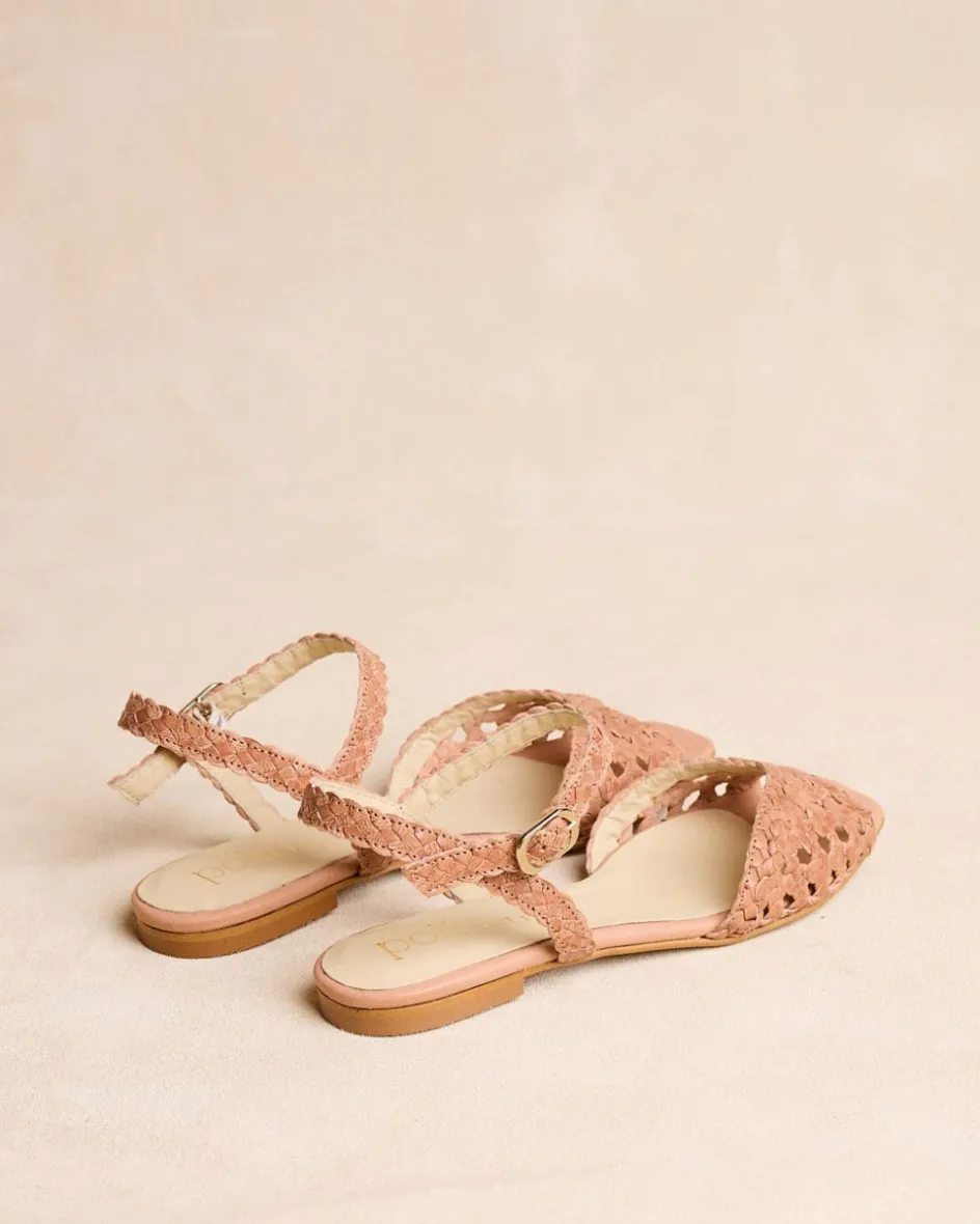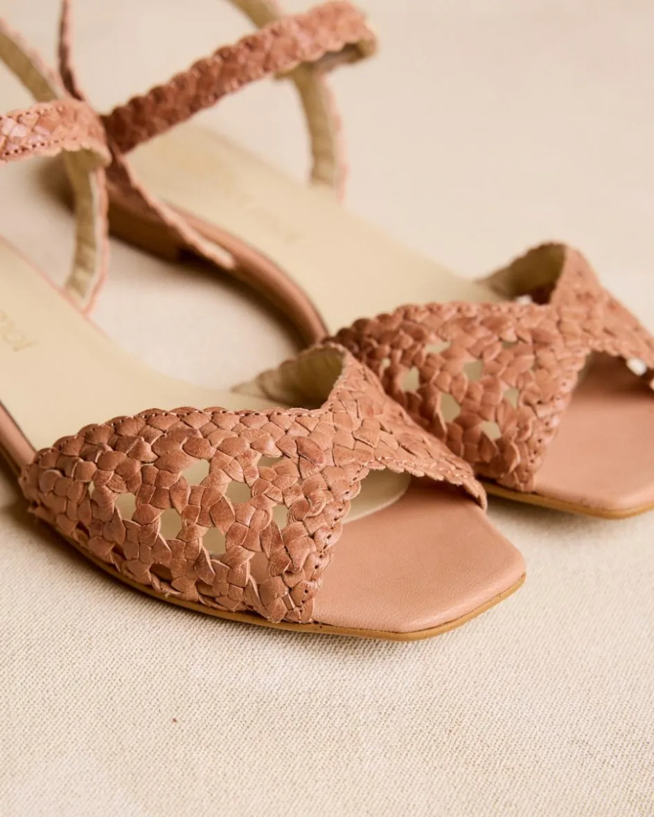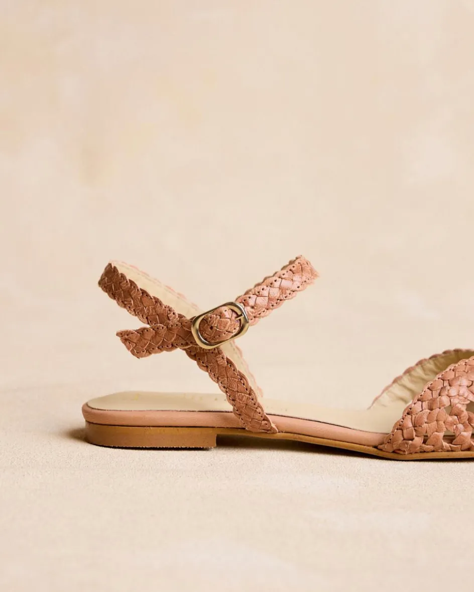 Sandale en cuir camel avec finition tressée. Encolure en forme de papillon. Bout légèrement carré avec ouverture. Soutien de la cheville par une bride tressée avec boucle pour un ajustement confortable. C’est une sandale idéale et confortable à combiner cette saison avec vos vêtements préférés.