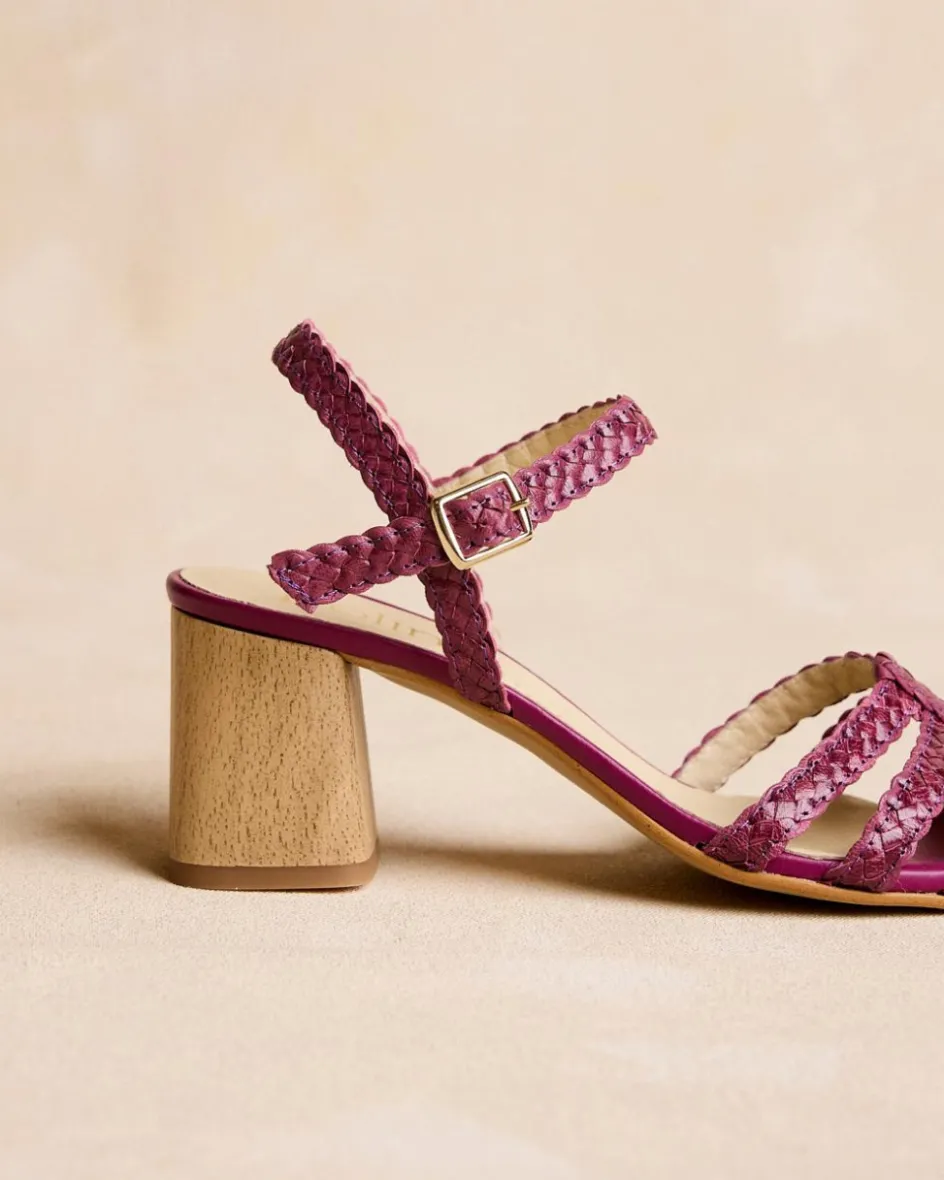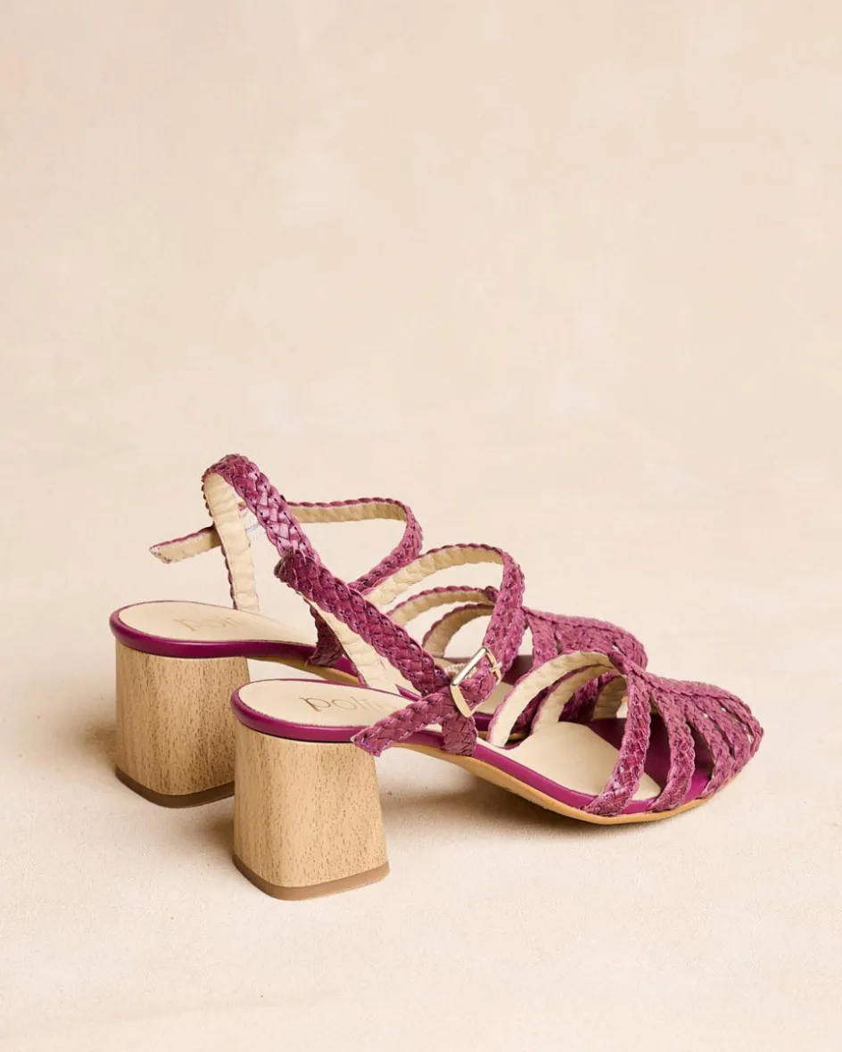 Sandale en cuir tressé violet. Bout arrondi avec détail de ruban tressé croisé. Talon fermé par une bride en cuir. Cheville avec rendez-vous avec boucle pour un meilleur ajustement. Talon carré en bois. Une sandale très spéciale et élégante pour cette saison.